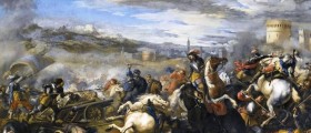 Battaglia con fanteria, cavalleria e cannoni con la città sullo sfondo![]()