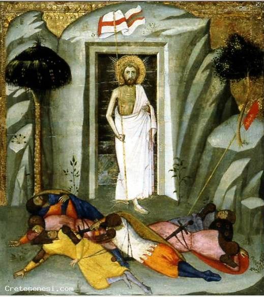 La Rappresentazione del della Resurrezione del Cristo era un tema molto comune nell’arte italiana tra il XIV ed XV secolo. In questo pannello si intravede l’interno della caverna con il sarcofago in marmo scoperto, ora vuoto. La cornice dell’entrata vuota ed in ombra della Tomba, crea un grande contrasto con la luce irradiata dal Cristo risorto che emerge trionfante dall’oscurità. Questa scena era l’ultima di una serie di 5 pannelli di una Predella che rappresentava la Passione di Cristo. La sequenza includeva : Il Tradimento di Giuda, la Via del Calvario, la Crocifissione, la morte, e si concludeva con questo pannello, la Resurrezione. I 4 pannelli mancanti attualmente fanno parte di un’altra collezione.
