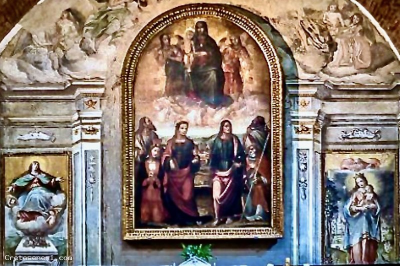 Pala della bottega del Sodoma, raffigurante la Madonna col Bambino, angeli e santi è posta dietro l’altare sopra il coro ligneo. L’opera è inserita all’interno di una finta architettura, dipinta a fresco, su cui spiccano due scene mariane: l’Assunzione della Vergine e l’Incoronazione di Maria.
