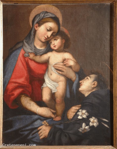 L'opera, di proprietà del Conservatorio di San Carlo Borromeo, è attualmente esposto nel Museo Diocesano d'Arte Sacra di Pienza. Laura Martini attribuisce l'opera alla produzione giovanile di Francesco Nasini, il prolifico pittore amiatino capostipite della nota famiglia di artisti. Francesco si colloca stilisticamente in un ambito compreso tral "maniera" e "naturalismo": formatosi infatti alla scuola del vecchio Rutilio Manetti, si mostra però ancora attentissimo alle vicende artistiche senesi del Cinquecento dal Sodoma al Beccafumi fino a Francesco Vanni. Secondo Laura Martini il dipinto pientino nelle tipologie del gruppo sacro, nell'impasto morbido e nella concreta resa naturalistica del Santo di profilo, si ispira alla maniera di Rutilio Manetti.