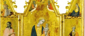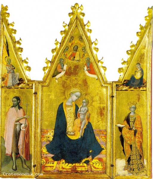 Il piccolo trittico, proveniente dal Capitolo della Cattedrale pientina, rappresenta nel suo scomparto centrale la Madonna dell’umiltà, nelle ante San Giovanni Battista e Santa Caterina d’Alessandria e nelle cuspidi il Cristo Benedicente tra angeli e Profeti, l’Angelo Annunciante e la Vergine Annunciata.