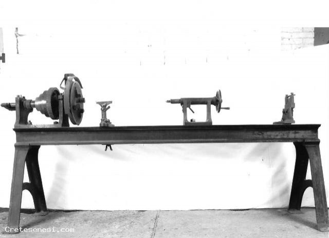 Questo particolare tornio, costruito per lavorare pezzi di ferro è stato poi utilizzato per tornire pezzi di legno. In particolare è stato utilizzato per costruite mozzi da carri e carretti di varie dimensioni.