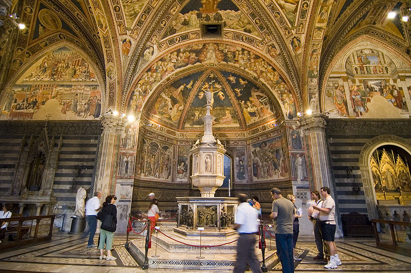 Gli affreschi sono del Vecchietta e della sua scuola, di Michele di Matteo da Bologna, di Benvenuto di Giovanni, della scuola di Jacopo della Quercia e forse uno di Piero Orioli.