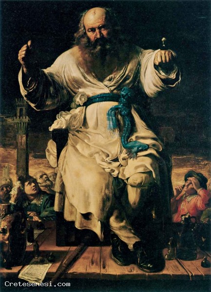 Purchased by the Monte dei Paschi di Siena in 1984, the painting originally belonged to the collection of Florence Gerini: lower left, above the sheet that protrudes from the stage on which sits the charlatan, appear the sign ("In Siena Bernardino Mei Painter ") and the probable date of execution of the canvas (you can imagine will be the year" 1656 "). The unusual iconography and the originality of the subject provide the modern viewer a true slice of customs, traditions and beliefs that were to characterize the social context of Siena - Siena and not only - in the middle of the seventeenth century. The old charlatan sits on a wooden stage surrounded by the "tools" of their trade, bottles and glass jars containing healing potions from unlikely. The view from the bottom seems to accentuate the grandeur of the ambiguous character whose body mass is amplified by overlapping and continuous dall'ingolfarsi countless layers of clothes. The performance of the mysterious healing takes place within the walls of the city of Siena, as the profile of the Mangia tower that is visible at the bottom, on the left of the picture. The thick beard new philosopher, look sharp, piercing and the peremptory gestures arouse fearful amazement of the crowd that gathers cautious at the foot of the stage, not everyone seems to still suffer the dark influence of the arcane character: among the onlookers stunned fits even the skeptic who, staring at the old bearded, suspicious sniffs the contents of a small vial. The adoption of a treatment luministic strongly opposed, characterized by the juxtaposition of large areas of deep shadows and bright with wrap-around help to accentuate the suspended atmosphere and disturbing that circulates inside painting, on which rests the dark mass of stormy sky.
