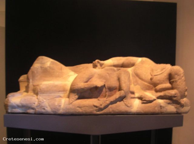 La scultura, recuperata in numerosi frammenti durante gli scavi degli anni Sessanta presso il tumulo del Molinello, costituisce il coperchio di una grande urna cineraria con coppia di sposi a banchetto, che secondo il costume dell'epoca sono raffigurati in posizione distesa. Il monumento funerario, originariamente arricchito da una vivace policromia, è datato agli anni 520-510 a.C. e per l'Etruria settentrionale rappresenta il più antico esempio a tutto tondo con questo tipo di scena.