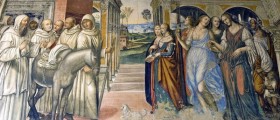 The background has a magnificent architectural setting and the scene has people divided into two groups: on the right the young women, some dancing and left the monks with St. Benedict. Perhaps the best fresco of the group, with significant influences Leonardo.