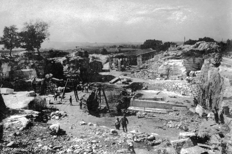 Sul lato destro, sopra un banco di travertino, si vedono le ruote usate per i fili necessari al taglio verticale delle pareti di travertino.