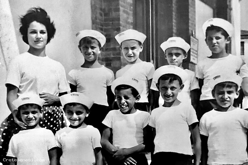 Gruppo di ragazzi in colonia a Calambrone di Pisa, come usava a quei tempi, all'uscita dalla chiesa.