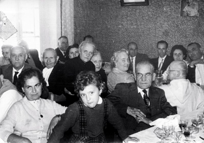 Classico pranzo matrimoniale dell'epoca, connotato da un numero rilevante di invitati. Partendo da Sinistra in alto verso destra, si riconoscono: Amelia Tozzi ? Prof Stefanacchi, medico Giovanna Scarpini Aroldo Puglioli Mario Tognazzi, lo sposo Franca Scarpini, la sposa Luigi scarpini, detto Gigi dell'Esattoria ? Massimo Scarpini Amelia Giovanna Scarpini nei Ravaglia Rosa Piochi Zaira Scarpini Maria Stefanacci Zelinda Giannessi ?, la bambina Palmiero Piochi Don Modesto Scarpini, monaco Olivetano