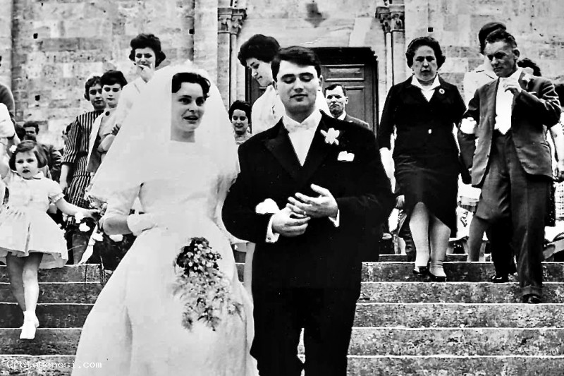 La foto li ritrae, ormai sposati, mentre scendono le scale della chiesa circondati da parenti e amici.