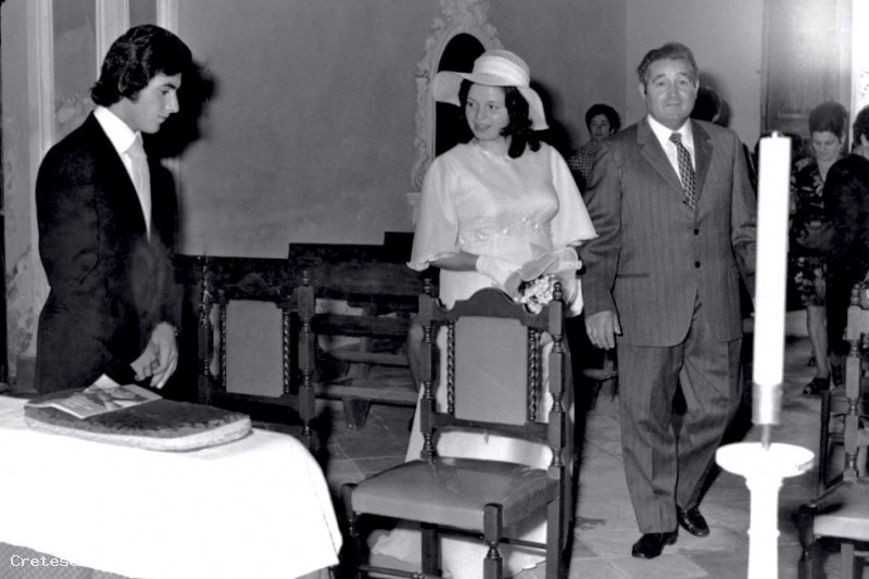 La sposa all'arrivo accompagnata dal padre. Sullo sfondo la madre della sposa con una grande crocchia.