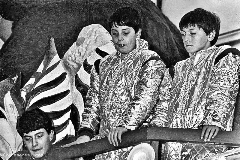 Questo insolito costume tutto argentato è l'imitazione di una tuta da astronauta, a quel tempo abbastanza di moda.