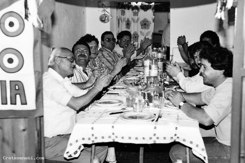 Nella foto, il pranzo con gli amici, organizzato nel garage di casa di Piero Moscatelli, proprietario del bar. Piero, che per l'occasione si è prestato a fare il cuoco, cucinando per tutti.