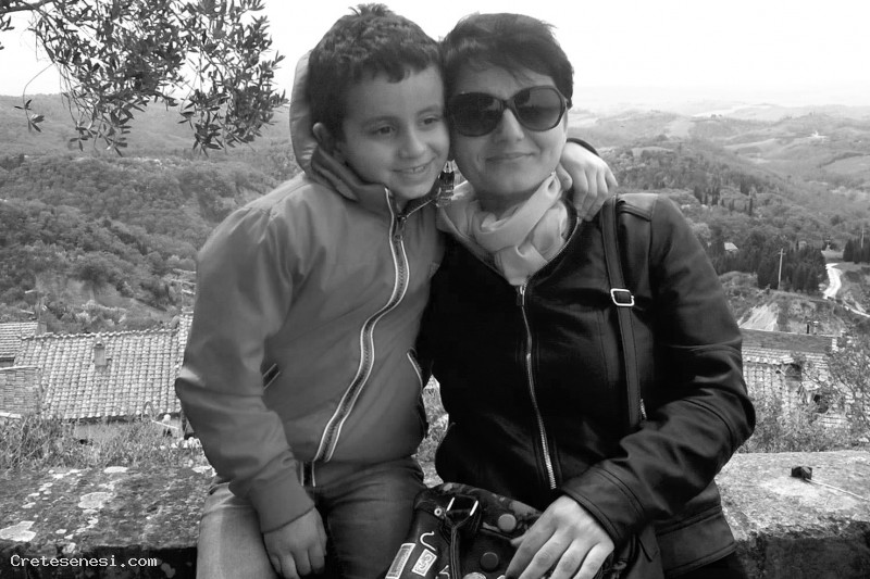 Antonella Conte con l'amato figlio Matteo, immersa in uno splendido paesaggio delle Crete, in occasione della Festa del Carciofo di Chiusure.