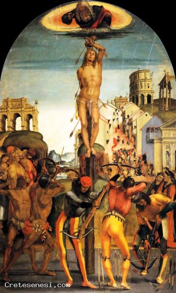 La scena è ispirata palesemente al Martirio di san Sebastiano del Pollaiolo, già nella Cappella Pucci della basilica della Santissima Annunziata a Firenze, con un analogo santo issato su alto palo attorno al quale ruotano alcuni balestrieri che lo colpiscono con le frecce. Analogo è anche il richiamo antiquario alle rovine antiche, in questo caso un arco di trionfo a sinistra, un pezzo di anfiteatro e di una loggia a destra. Al centro si apre la consueta vallata fluviale con le montagne azzurrine che scolorano in lontananza per effetto della foschia, mentre a destra del santo si scorge la parte più originale della pala, la ripida strada di un borgo medievale rappresentata dettagliatamente, con le sue casette vivacizzate dai balconi, le figurette affacciate o in strada, tra cui una squadra di soldati a piedi e a cavallo che sta conducendo il santo imprigionato al luogo del martirio; chiude a destra la metà di una facciata di una chiesa rinascimentale. Nel cielo azzurro, che schiarisce verso l'orizzonte, appare in alto la figura dell'Eterno che con la sua benedizione e la mano distesa protegge il santo che, guardando verso di lui, accetta con rassegnazione il martirio. Tempera su tavola, 288x175 cm