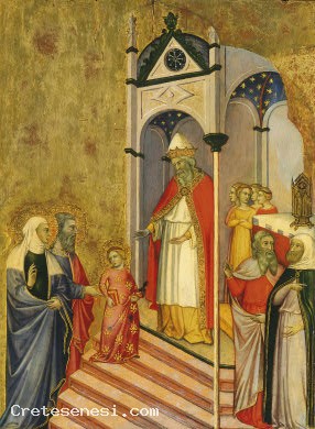 Terzo Pannello della Predella sulla vita di Maria, (fascia dipinta divisa in più riquadri che faceva da corredo alle pale d'altare, dove vengono narrati in sequenza degli eventi). Il pannello mostra la giovane Vergine che entra nello stesso portico del Tempio dove viene accolta dallo stesso Prete che un tempo allontanò i suoi genitori dal luogo di culto perché considerati indegni. La continuità da realismo alla scena malgrado nonostante l’oro sullo sfondo.