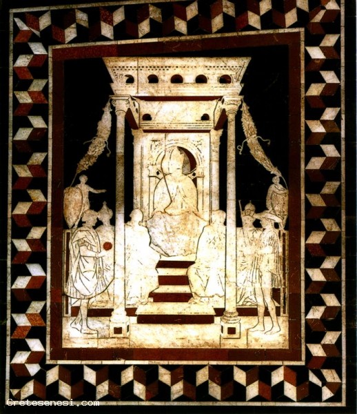 In 1431 Emperor Sigismund visited Siena and citizens hoped fervently that he would take their part in the war against Florence: therefore his figure is between scenes of war, as the tutelary deity of a conflict deemed imminent. The Emperor is shown seated on a throne in a kiosk Renaissance, with a niche, with a frieze oculi, columns and festoons governed by two putti heraldic shields with the imperial eagle. On the steps before the throne there are six figures sitting or standing, whose clothing helps detect in court dignitaries, civil and military. The scene was paid in 1434 to Domenico di Bartolo and is an important record of the update issues renaissance in the land of Siena: the use of the perfect centric perspective in the 30s is an achievement that in those same years in the same Florence was sporadically applied. The box was already restored in 1485 and again in the second half of the nineteenth century.