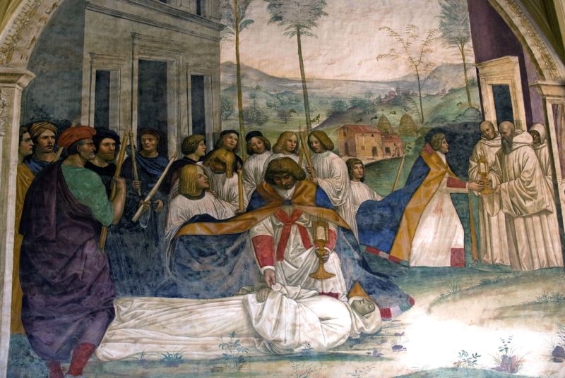 33 - Come Benedetto fa portare il corpo di Cristo sopra al monaco che la terra non voleva ricevere Asciano