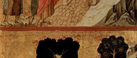 Sopra - CRISTO E I PELLEGRINI VERSO EMMAUS: Questo, l'ultimo riquadro del ciclo, ha una grande forza evocativa: la città palestinese si presenta agli occhi dei pellegrini, imponente e splendente, ben stabile sulle rocce in uno sfondo dorato.