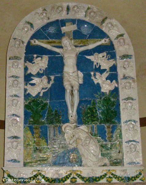 Inside there is represented a crucifixion with Mary Magdalene at the foot of the cross, kneeling in prayer