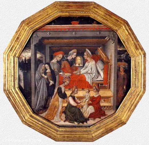 Questo tipo di oggetti, veniva donato alle puerpere, al momento del parto, ma anche in occasione di nozze come augurio, ed era inizialmente utilizzato per portare la tazza di brodo per la puerpera, come si può ben vedere in molti dipinti raffiguranti nascite. Utilizzato anche per offrire doni e oggetti alla neomamma, per tutto il Quattrocento era costituito da un grande piatto di legno dipinto, spesso anche da importanti artisti; dal Cinquecento, per il brodo venne adottato il set di tazza e piatto in maiolica o in ceramica e nelle famiglie più ricche in argento o peltro. L'opera appare dipinta sui due lati, sul recto con la raffigurazione della Nascita del Battista, e sul verso con due putti,di cui uno col tamburello, forse allusivi alla nascita di due gemelli, raffigurati in un giardino carico di fiori, con amuleti di corallo al collo e ai polsi, segni bene augurali per i neonati.