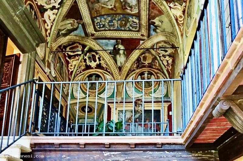 The Library room, commissioned by Abbot Francesco Ringhieri in 1515, was designed by his brother fra Giovanni da Verona, who also sculpted the capitals in pietra serena, carved the entrance door, the cupboard for the choirs today on the wall of background and the large wooden candelabra from 1502, placed in the middle of the room for lighting.