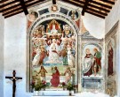Instead the three saints: San Girolamo, San Rocco and Santa Lucia, painted in fake newsstands on the wall to the right of the main altar, are the work of young students from the workshop of Benvenuto di Giovanni and are specifically dated 1497.