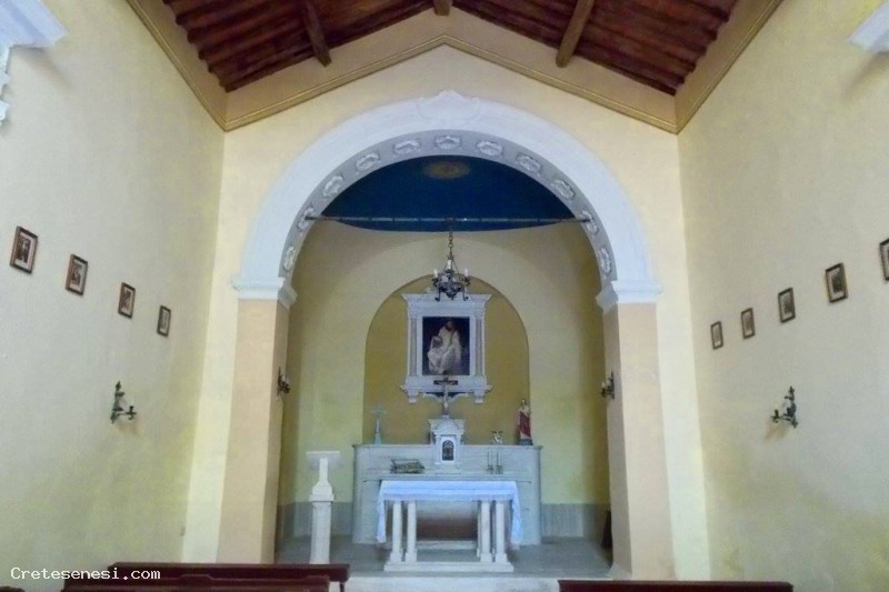 The small church is part of a group of houses in the village of Poggio Pinel. Externally it has a gabled profile: the elements that make up the facade, which is the base, the portal architrave and the rectangular window are all made of travertine, the local stone that is mined in the immediate vicinity of the place.