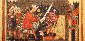 Nella scena si vede Riggo, camuffato da Totila di fronte alla figura del santo che lo invi...