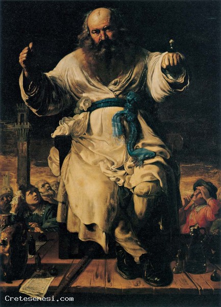 The old charlatan sits on a wooden stage surrounded by the "tools" of their trade, bottles and glass jars containing healing potions from unlikely. The view from the bottom seems to accentuate the grandeur of the ambiguous character whose body mass is amplified by overlapping and continuous dall'ingolfarsi countless layers of clothes. The performance of the mysterious healing takes place within the walls of the city of Siena, as the profile of the Mangia tower that is visible at the bottom, on the left of the picture. The thick beard new philosopher, look sharp, piercing and the peremptory gestures arouse fearful amazement of the crowd that gathers cautious at the foot of the stage, not everyone seems to still suffer the dark influence of the arcane character: among the onlookers stunned fits even the skeptic who, staring at the old bearded, suspicious sniffs the contents of a small vial.