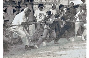 Foto piuttosto inusuale che ritrae tre cavatori nel momento di innescare il ribaltamento d...