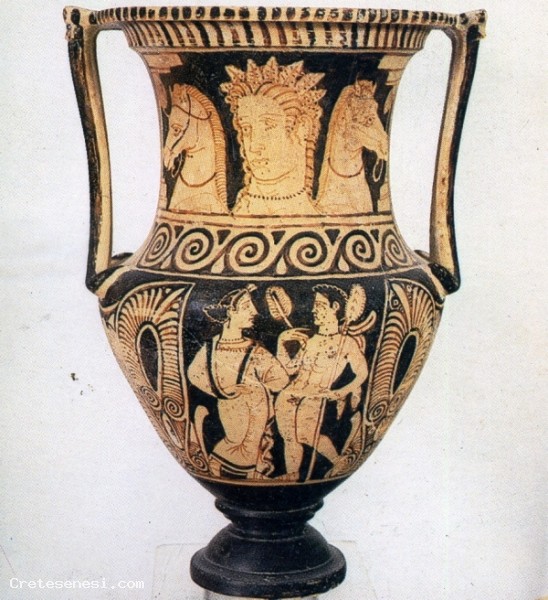 Il cratere proviene dalla tomba III della necropoli di Poggio Pinci, presso Asciano