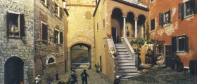 Caratteristico scorcio del paese interno alla Porta dei Tintori arricchito con la rappresentazione di arti e mestieri del 1921.