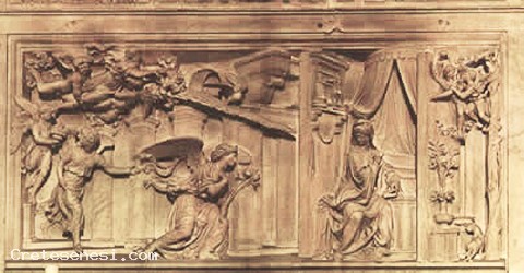 Nel 1513 il Sansovino venne noniminato da Leone X capo e maestro generale del Santuario della Santa Casa di Loreto alla decorazione della cui cappella, disegnata dal Bramante, attese eseguendo i rilievi con l'Annunciazione, l'Adorazione dei pastori e lo Sposalizio della Vergine. Nei rilievi di Loreto (specie nell' Annunciazione) Andrea Contucci seppe essere complesso, tecnicamente audace, narrativo e però intellettualistico, nello studio dello scenario prospettico, risolto in un abile, ghibertiano contrapporsi tra figure quasi a tutto tondo, rispetto alla composizione architettonica dei fondi. Sia come scultore sia come architetto, il Sansovino risulta ancora legato a modi quattrocenteschi, esili e tersi, congiunti a un gusto decorativo che echeggia i modi lombardi diffusi a Roma; nella sua opera si precisa via via l'attenzione al classicismo romano attraverso la lezione di Bramante e Raffaello.