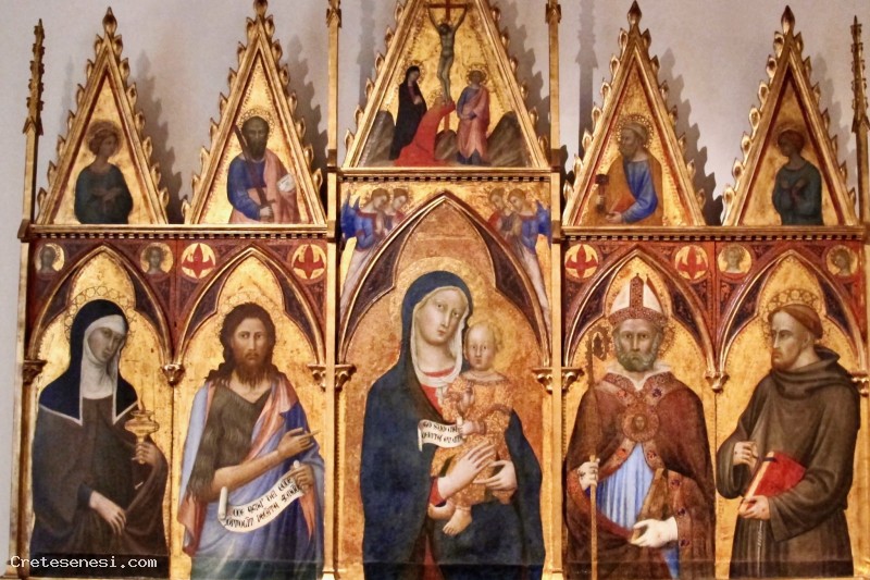 If present separately in due fasce: in whatla inferiore, di maggiorii proporzioni, troviamo al centro la Vergine con en braccio il Bambino. Ai suoi lati scopriamo, a sinistra, santa Chiara e san Giovanni Battista mentre, a destra, ci sono le immagini di sant'Agostino e san Francesco d'Assisi. nella fascia superiore, composta da cuspidi, si scopre nella scene centrale la scene del Cristo crocifisso con ai piedi della croce le figure della Madonna, di San Giovanni Evangelista e della Santa Maria Maddalena. The other parts of the picture will sound a little more difficult to interpret. Agostino vi è dipinto come vescovo e Dottore della Chiesa: in testa carried the mitra, indossa il piviale e con la mano destra impugna il bastone pastorale. With the sinister hand she brought a red book to her pet. On his face, abbellito da folta barba riccioluta, ha un aspetto stereotipato, tipico della pictura del secolo.