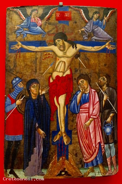 The icon depicting the Crucifixion is the oldest work preserved in the Museum of Lucignano. It is a table of the second half of the thirteenth century, devoid of certain paternity, although recent studies have identified the area of origin in the painting school in Arezzo, although influenced by Sienese and Umbrian masters. This icon is escaped to a tragic fate twice during the twentieth century. A first time during the previous work staging of the museum, was exchanged for a wooden board and used for mixing any lime. Luckily someone noticed this painting on one side and immediately began the restoration. In 1979 it was stolen along with other parts of the museum and found the following year, with no damage.