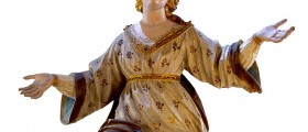 In fact, we do not know of any of his statues made in a kneeling position. In addition, the saint is always depicted with her right hand holding a tray with the two breasts that were removed before her final martyrdom. In this case, the position of his arms seems to represent an adoring attitude.