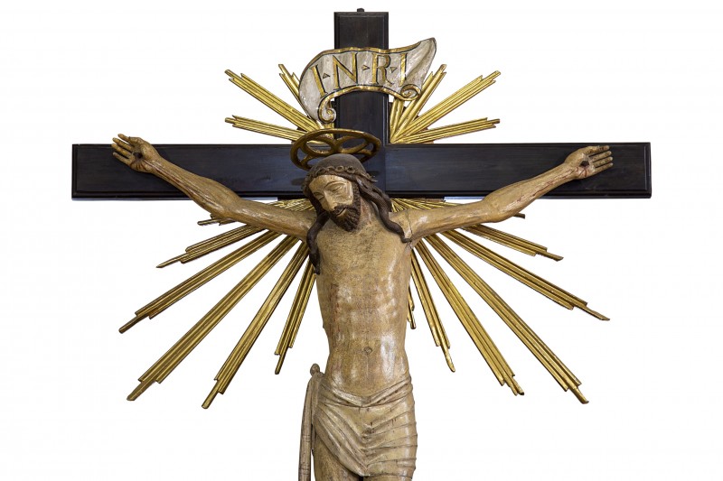 Large wooden crucifix, carved by a talented unknown artist and dating back to 1440, date reported on the original cross.