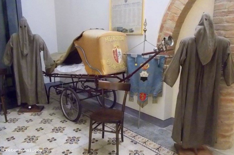 Although the first brotherhoods date back to the thirteenth century, the Buonconvento Mercy was formed in 1595. However, the oldest information about a brotherhood in Buonconvento dates back to 1410, when it was mentioned in the documents the lay company of St. Peter, but just as old, if not pre-existing, was that of Corpus Christi; both came together in 1610 under the title of the second.