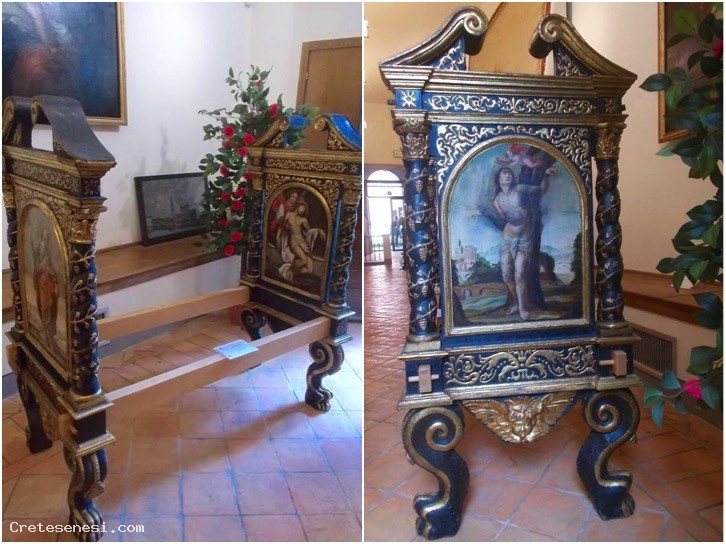 In the next room are placed some relevant liturgical objects, kept in a glass case, the painting of St. Catherine, St. Dominic and the Mysteries of the Rosary painted by Stefano Volpi around 1630 to contain the Madonna and Child by Duccio, a painted wood sculpture of St. Anthony of Padua and the bier of the seventeenth century.