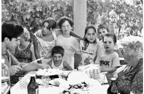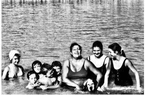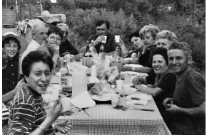 Due fmiglie di amici a merenda in campagna, ai bordi di un laghetto. Da sinistra: ...