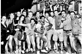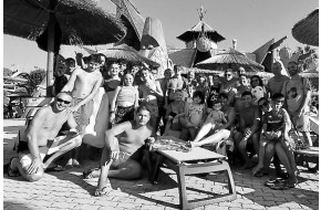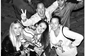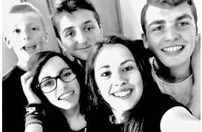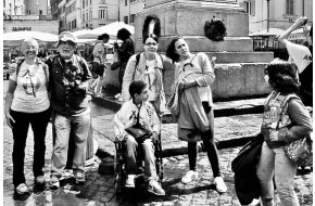 Singolare collocazione per una foto fra amici. Infatti, le persone si trovano sul lato si...
