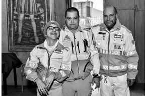 Tre volontari della Misericordia di Asciano seduti sul murello della piazzetta di San Fran...