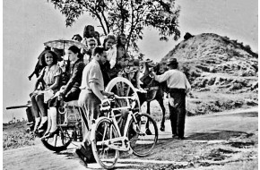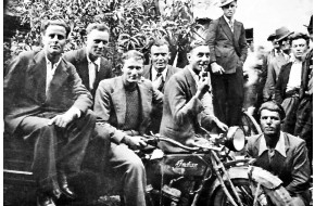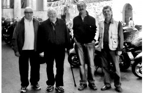 Foto molto bella di un gruppo di amici di allora, appollaiati su una moto con cassone di c...