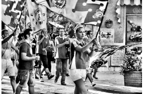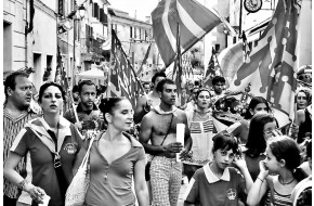 Antonio Deriu detto Pampero, fantino della contrada del Prato, circondato dai contrad...