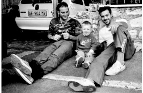Tre conoscenti che scherzano allegramente davanti alla strada di accesso al podere il Caso...