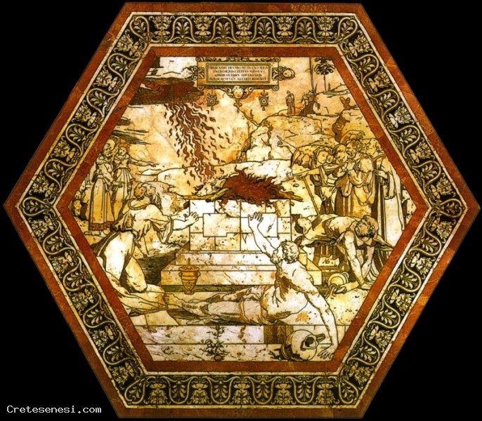 Il sacrificio di Elia, rispetto a quello dei sacerdoti del precedente esagono, ha ben altro risultato, rappesentato con le fiamme divine che piovendo dal cielo,accendono la pira nonostante fosse bagnata e di legna verde. L'evento miracoloso stupisce tutti gli astanti (I Re, 18, 30-39). Elia è rappresentato inginocchiato a sinistra, mentre dall'altro lato i sacerdoti di Baal assistono sgomenti, come suggerisce anche la figura inclinata sullo scalino in primo piano, che fa rovesciare l'anfora con cui era stata bagnata la legna. Il riquadro è su disegno del Beccafumi e spicca per la ricchezza di personaggi, variati nelle pose e negli atteggiamenti, ma tutti ricondotti a uno schema di armoniosa simmetria, di stampo raffaellesco.