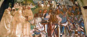 L’affresco che mostra la storia del Re Totila che vuole conoscere San Benedetto e manda a parlare con lui uno scudiero vestito come un Re per vedere se il Santo si accorge della sostituzione, lo scudiero è inginocchiato fino a terra mentre Totila -che è il vero Re- gli sta accanto (solo i servi si inginocchiano, i Re non si inginocchiano mai) ma lo sguardo di San Benedetto è tale da aver capito l’imbroglio, dietro a Totila una sua guardia del corpo tiene stretto un pugnale pronto ad intervenire per difendere il Re.