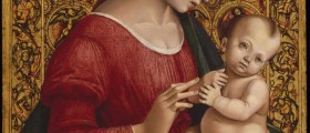 L'estrema dolcezza dell'espressione della Vergine che fa di questo uno dei volti più belli mai dipinti da Luca Signorelli rimane a memento dell'amore del pittore per sua figlia, Gabriella. La tavola venne infatti donata nel 1507 da Luca all'unica figlia ancora in vita e la descrizione precisa che ne viene data nel documento rintracciato nell'archivio di Stato di Firenze permette l'identificazione del dono con quest'opera di New York. Databile tra il 1505 e il 1507, grazie a confronti stilistici con opere di questo periodo, la tavola è l'unica nel catalogo di Signorelli ad avere uno sfondo così elaborato. Il fondo oro viene quasi graffito ad ospitare i profili di due imperatori romani (Domiziano a sinistra e Caracalla a destra) e numerosi putti in pose e gesti diversi. Roger Fry ipotizzò che potesse trattarsi di un “corame”, cioè di una decorazione parietale realizzata con pelle dipinta e stampigliata che veniva usata per ricoprire le pareti delle sale più importanti di eleganti dimore. Ancora oggi il significato e l'eventuale simbologia di questo sfondo rimangono un enigma non risolto. Il legame tra i due protagonisti è sottolineato dal gesto affettuoso della Madre che sembra quasi cercare le mani del Figlio intento invece a ritrarre il braccio destro e a guardare fuori dal quadro a prefigurare la sua fine. Olio su tavola, cm. 51,4 x 47,6