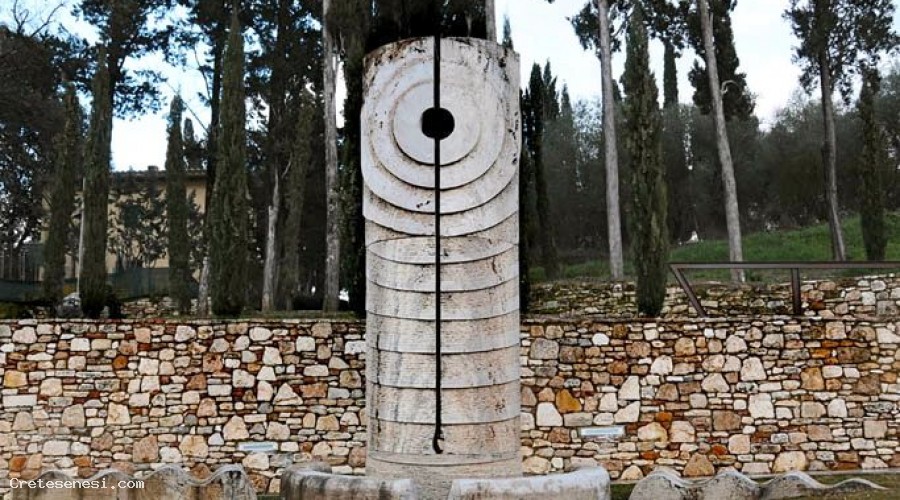The sculpture rapolanese, located along the main road axis of the city, shows the stylistic traits recurring in the art of Ogata: the monumental structure, which has the solemnity of an obelisk, consists of purely geometric elements, such as the series of concentric circles and the central hole, interrupted by the vertical cut which is reflected on the base and on calm 'shockwave' given off to the sides.Sculrura modern placed in the middle of the roundabout on the main road north to Gunsmith.